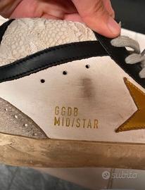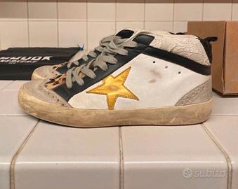 Sneakers Golden Goose Deluxe Brand (GGDB) ORIGINALI Taglia: 37 EUR. Modello Mid Star White Leather/Gold Star/Leopard. Un mix perfetto di stile artigianale e dettagli luxury. Base in pelle bianca con l'iconica stella laterale in oro e inserti in suede leopardato. Condizioni; in ottimo stato. Nota per i meno esperti: l'effetto "vissuto" (dirty effect) su suola e tomaia è una caratteristica distintiva del brand; fatta a mano in Italia, non un difetto d'uso. Full Set: Incluse di scatola originale, dustbag (sacca protettiva) nera e lacci logati "Golden Goose" di ricambio ancora nuovi. Autenticità: 100% originali (codice modello G36WS634.V5 verificabile su etichetta).