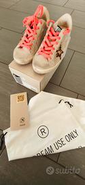 Golden goose originali donna, n.37, di tela beige glitterata con macchie effetto vintage, stella leopardata, lacci aranciati.