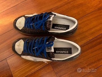 Vendo Golden Goose uomo numero 43, modello Stardan LAB con tomaia in glitter marroni e stella nera limited edition numero 188/654 utilizzate 2 volte, ancora come nuove. Vendo con il suo sacchetto. Prezzo leggermente trattabile.