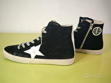 sneakers alte Golden Goose Francy in camoscio nero, con l'iconica stella laterale in pelle bianca e chiusura laterale con zip.