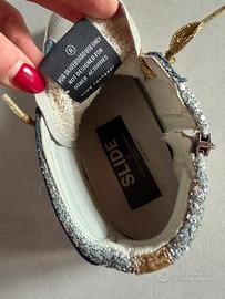 Vendesi scarpe Golden Goose modello SLIDE, tutt ora in vendita, vendo causa inutilizzo, vero pellame, fatte a mano. Dettagli fantastici, lacci in filo dorato. Eventuali colorazioni o “effetti” sulla scarpa sono stati creati proprio dall azienda, che li utilizza come segni distintivi. Scarpa pari al nuovo, indossata una volta. (NUMERO 40)
