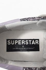 Superstar sneakers originali con tomaia glitter argento con riflessi lilla, stella laterale in pelle marrone, tallone lilla pastello, lacci beige e suola in gomma con battistrada a lisca di pesce tipico Golden Goose.