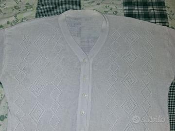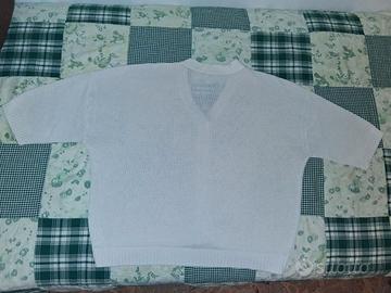Pullover - Golfino - Cardigan a maniche corte Vintage realizzato ai ferri in filo di cotone puro. Motivi della maglia: colonne di rombi verticali. Modello corto sotto la vita. Chiusura sul davanti con bottoni. Colore: Bianco. Il filo in cotone è fresco, traspirante, leggero e leggermente elasticizzato per sua natura per cui si adatta a forme anche abbondanti. Taglia Unica con vestibilità ampia (da una 42 a una 50). Articolo Vintage anni 70 rigorosamente Made in Italy. In perfette condizioni, nessun difetto, tessuto perfetto, nonostante gli anni è praticamente nuovo e solo conservato in un cassetto. Comunque è stato lavato, pulito e sanificato.