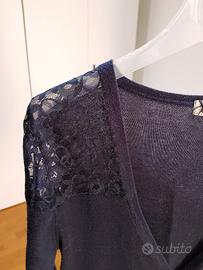 Golfino elegante con dettagli in pizzo sulle spalle e sul collo. - Maniche tre quarti. - Scollo a V.