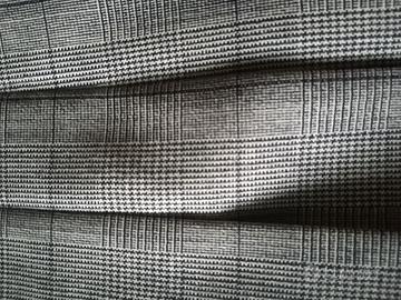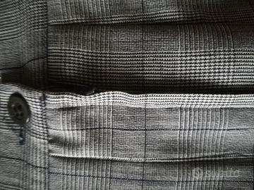 gonna a pieghe in tessuto antistiro "principe di Galles", grigio chiaro con sottili righe blu, fodera blu, allacciatura con zip e bottone in tinta, giro vita cm 75, lunghezza cm 70. Nuova, mai utilizzata