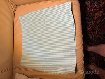 Gonna in morbido cotone taglia riportata 38 ma veste un pò grande, almeno 40 e cmq le misure sono: vita 36 circa, lunghezza 39. La gonna di un morbido cotone a righe bianche e verde (verde chiaro) è ben rifinita e con fodera bianca con impresse le "meduse" di Versace.