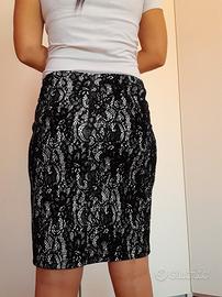 Bellissima gonna a tubino (pencil skirt) caratterizzata da un raffinato rivestimento in pizzo nero su fondo bianco a contrasto. Un capo elegante e versatile, ideale sia per l'ufficio che per un'uscita serale.