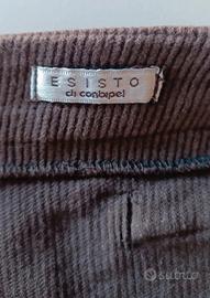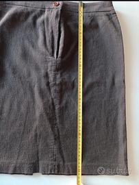 Gonna di velluto a coste, colore marrone. Chiusura con bottone e cerniera; piccolo spacco e finte tasche applicate. Vita 36 cm, lunghezza 50 cm. In ottime condizioni, quasi nuova.