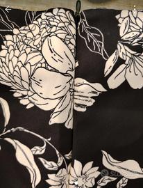 Gonna ampia fondo nero con fiori bianchi. Lunghezza dalla vita 63cm. Chiusa da una cerniera a scomparsa e bottoncino. Poliestere