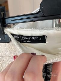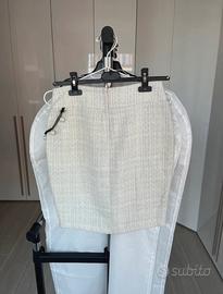 Gonna bianca a matita in tessuto bouclet e applicazioni di perle, velluto e pizzo. Le strisce di velluto sul davanti si sono leggermente ingiallite. Molto elegante sia con una camicia, che con un maglione.