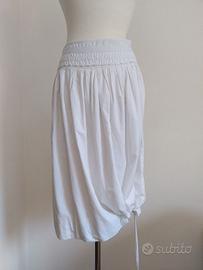 Gonna Weekend Max Mara lunghezza sotto al ginocchio in cotone bianco fresco e leggero, fodera interna in garza di cotone, presenta una coulisse sul fondo che consente di creare dei giochi di volume. Segnalo la catenella della zip mancante (problema facilmente risolvibile), altrimenti capo in ottimo stato. Taglia S, misure: vita (alta) 36 cm, lunghezza 71 cm.