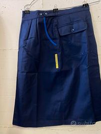 Gonna blu in cotone pesante con tasche laterali e posteriori. Grande piega sul davanti e cinturino regolabile. Taglie dalla 40 alla 48