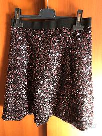 Gonna corta, con paillettes viola. Elastico nero in vita. Taglia XS. mai usata, ancora con il carellino. Prezzo originale 63