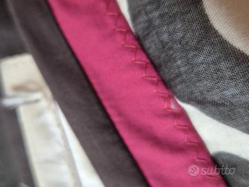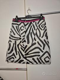 Gonna di cotone al ginocchio con disegni neri su fondo bianco con in vita fascetta color fucsia e nera.