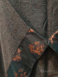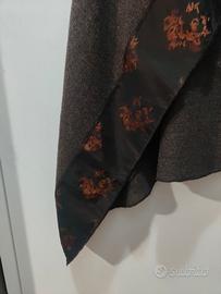 Gonna donna in stile etnico. Lana con profili in seta ricamata con bottone sul retro che fa effetto asimmetrico.Si può portare anche non abbottonata. Ha la cerniera sul retro. Taglia S/M
