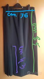 Gonna lunga, elegante. Colore grigio. Gessata, con spacco. Foderata.