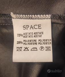 Il tessuto è di un grigio scuro con effetto lucentezza cangiante. Leggermente elasticizzata oer la presenza di una percentuale di elastan, la gonna aderisce alla figura, adattandosi