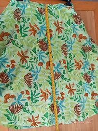 Gonna estiva di sartoria a mezza ruota . Puro cotone fantasia floreale. Disegni di foglie su sfondo verde. Misure in evidenza sulle foto
