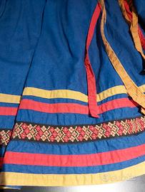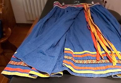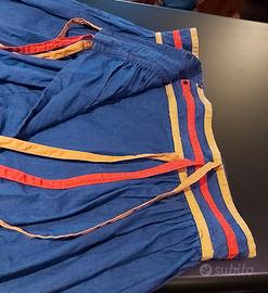 Coloratissima gonna a portafoglio midi in stile folk. Colore bluette, con dettagli in giallo, rosso e anche una passamaneria a soggetto floreale. 100% cotone, lavabile in lavatrice a 40°, stiratura con ferro a temperatura media. Apertura a portafoglio sul davanti, si allaccia in vita con tre bottoni automatici nascosti, oltre che con tre lacci che impreziosiscono il giro vita, riprendendo i colori dei decori sul fondo della gonna, lacci lunghi quanto l’intera lunghezza della gonna. Sui fianchi ci sono due tasche a fessura, che si mimetizzano con le pieghe del tessuto. Taglia 50. Capo usato veramente pochissimo, in ottime condizioni.