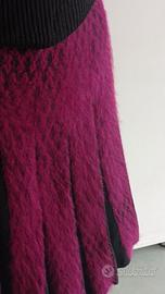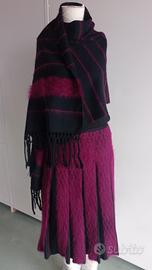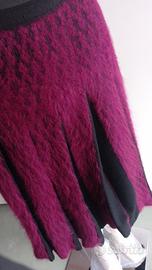 realizzata a telaio d'epoca. La parte superiore è in pura angora borgogna, per poi trasformarsi in un gioco fluido di pieghe profonde, ciascuna delineata da una riga in angora su fondo nero.