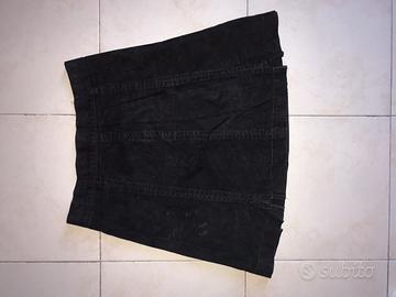 Gonna nera in camoscio effetto vintage, modello leggermente svasato a vita alta. Chiusura con zip e bottone, linee verticali che slanciano la figura.