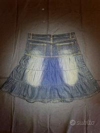Gonna in denim blu con taglio svasato e dettagli a balze, stile anni 2000. Vita media, chiusura con bottone e zip. Un capo versatile, perfetto per look casual o Y2K. In buone condizioni, indossata poche volte. Taglia S.