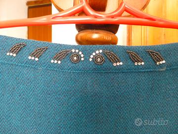 Gonna 100% lana. Fodera 100% acetato. Come nuova. Mai usata. Marca Noa Noa. Taglia italiana 44/46. Gonna a tubino, lunghezza midi. Chiusura lampo a scomparsa sul retro. Ricamo fatto a mano con strass cristallo e rocailles chiaro di luna sul davanti della cintura. Tessuto in lana spigato in smeraldo tono su tono. cuciture e rifiniture sartoriali.