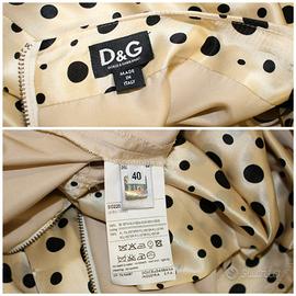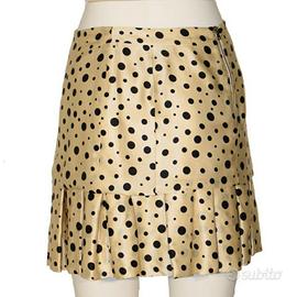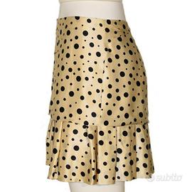 Gonna Dolce&Gabbana, 100% seta, taglia 40, leggermente a pieghe, fondo beige a pois neri. Molto originale nella forma, resta inizialmente diritta, poi partono morbide pieghe. Adatta sia per il giorno, ufficio, incontri, pranzi e cene di lavoro. Più sdrammatizzata se indossata con un dolcevita aderente o un sottogiacca nero. Elegante con un top di seta. Mai indossata.