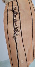 Gonna in seta,organza di base colore salmone e chiffon sovrapposto in color marrone,lavorata da fascette marroni ricamate cc on corallini luminoso.Sul lato destro applicazione di fiore di pizzo