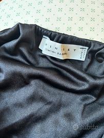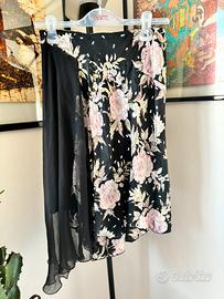 Gonna semi longuette Twin Set di Simona Barbieri taglia M in 100% seta, deliziosa fantasia di rose rosa ricamate su leggera seta e chiffon in tinta unita nera, foderata in 100% poliammide nera. Misure: larghezza vita con elastico invisibile minimo cm 65, massimo cm 88, lunghezza irregolare minimo cm 58 massima 76. Vestibilità massima per taglie 42/44 snella. Condizioni buone per l’usato, ricamo e canutiglie non mancanti, seta perfetta.