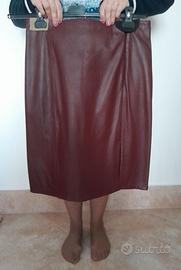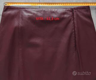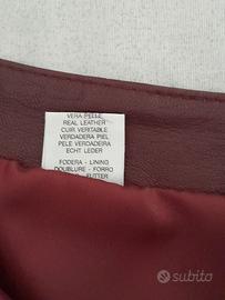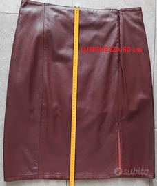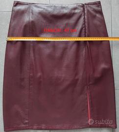 Gonna in vera pelle colore bordeaux con spacchetto laterale, senza cartellino ma mai usata. Taglia 48 ma vestibilità più ridotta