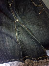 Gonna jeans blu scuro svasata e con soffietto sia sul davanti che sul dietro. Misure: Lunghezza 50 - Larghezza vita 40 - larghezza fianchi 49.