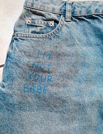 Modello dal taglio vintage con orlo sfrangiato e dettagli scritti ("I'M NOT YOUR BABE" e "OMG. YOUR EYES."). Perfetta per un look casual e originale! In ottime condizioni.