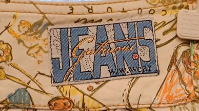 Gonna dritta longuette Gattinoni Jeans, bianca, con motivi fantasia e firma stampata. Modello a portafoglio fermato da due bottoni (firmati), pattina sul davanti. Lateralmente, all'orlo, ci sono due piegoni a soffietto. Il dietro è dritto con impunture ed etichetta in tessuto Gattinoni Jeans. Intorno al girovita ci sono anche i passanti. Taglia 50 italiana