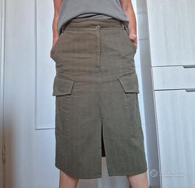 Gonna loungette con tasconi laterali, e tasche a filo, spacco davanti. Tessuto cotone jeans. Indossata una volta. Verde militare. Misure: larghezza cintura 38cm, lunghezza 70cm