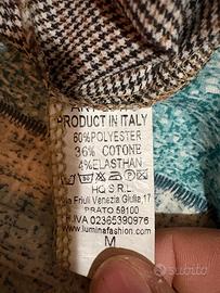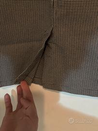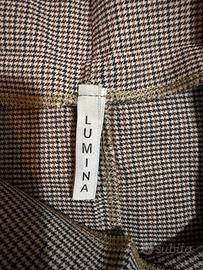 Gonna da donna marca Lumina, modello a tubino con fantasia pied de poule nei toni del marrone e nero. Vita alta e linea aderente che valorizza la silhouette. Tessuto leggermente elasticizzato per una vestibilità comoda. Taglia: S /IT 40 /EU 36 Condizioni: buone, con normali segni di utilizzo Ideale per outfit eleganti o da ufficio, perfetta con camicie, maglioni o blazer.