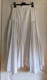 Gonna lunga, bianca, dal taglio ampio, orlo asimmetrico, vita alta; tessuto in cotone, leggero e fluido; designe unico ed originale. Perfetta per un loock elegante e sofisticato.