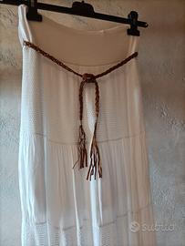 Gonna lunga bianca, estiva, con cinturino marrone abbinato. Tessuto cotone, con lavorazione forata nella parte anteriore.