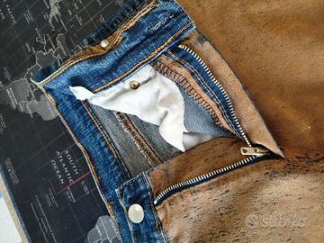 Gonna lunga oltre il ginocchio. Io sono alta 1.65 e come potete vedere dalla foto n.7 questa è la lunghezza della gonna. La gonna è di jeans ma sul davanti presenta l'effetto camosciato. Per indossare sul davanti vi è un bottone e cerniera ancora perfettamente funzionanti. È dotata anche di tasche
