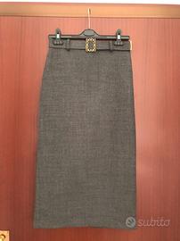 Elegantissima gonna grigia in lana con spacco e cinturina impreziosita da fibbia. Condizioni pari al nuovo