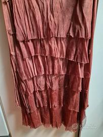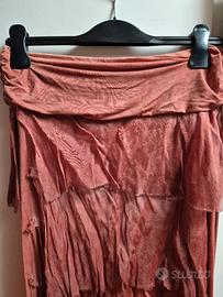 Gonna lunga con volant. Color mattone, fascia elastica morbida in vita. Misure: lunghezza 94 cm, larghezza 40 cm. Taglia 42/44. Eventualmente acquistabile in set con canotta beige, taglio irregolare, che fa diventare un abito