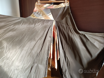 Originale gonna lunga, elegante, in raso stropicciato. Taglia S, marca Please, sfoderata, chiusura con zip laterale. La parte sopra si appoggia e disegna i fianchi mentre sotto si apre quasi a ruota con taglio svasato. Molto particolare.