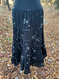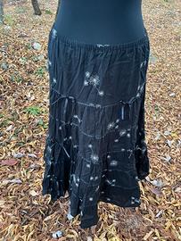 Gonna lunga/midi nera con fantasia floreale chiara, stile morbido e comodo.