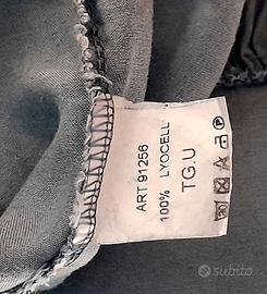 Gonna lunga taglia unica con elastico in vita e balza diagonale in fondo, colore azzurro jeans con motivi floreali in azzurro più scuro, 100% lyocell, confezionata in Italia. Tessuto morbidissimo e freschissimo. Nuova, ancora con cartellino.