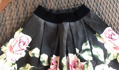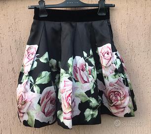 Vendo come nuova indossata solo per un evento, bellissima ed elegante gonna cerimonia matelassé stampata con tulle per renderla più ampia con pieghe piatte e balze con stampa rose su sfondo nero a festoni in tessuto matelassé con fodera in twill e tulle, lunghezza al ginocchio con chiusura a zip che veste anni 12/14 MONNALISA pagata 212€.