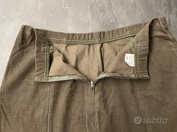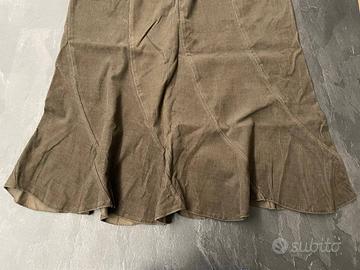 Gonna longuette color marrone cachi, lunga fin sotto al ginocchio, ondulata, con righe decorative davanti e dietro. La gonna è chiusa con una cerniera sulla parte posteriore, non ha fodera interna ma è di un cotone spesso, molto simile al velluto.