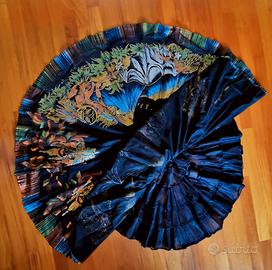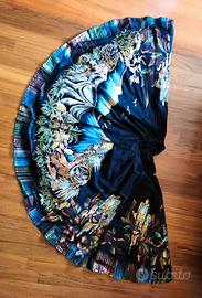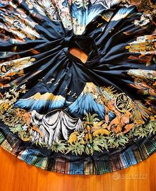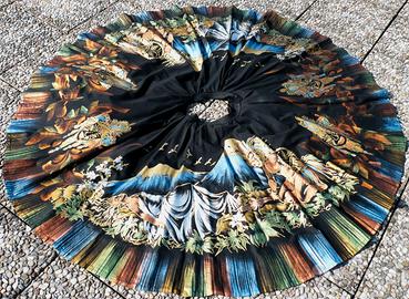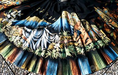 Superba realizzazione dipinta a mano su gonna a cerchio nera messicana degli anni 50, rappresentante la leggenda della montagna Iztaccihuatl e del vulcano Popocatepetl, la gonna è foderata da sottogonna in crinolina di 8 balze.