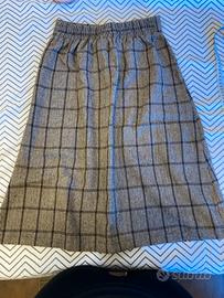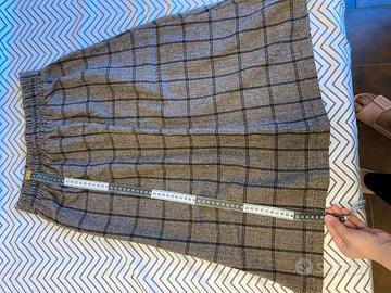 Bellissima gonna midi con fantasia a quadri classica (pied de poule/plaid). • Dettagli: Tre bottoni decorativi sul davanti e piega centrale elegante. • Vestibilità: Molto comoda grazie all'elastico in vita sul retro. Si adatta bene a diverse taglie. • Condizioni: Come nuova, ottima qualità del tessuto (ideale per il freddo). • Misure: Lunghezza circa 67 cm (vedi foto con metro).