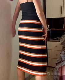 Elegante gonna midi aderente in buone condizioni. Con righe nere, bianche, beige e arancioni. Comoda e facile da abbinare, perfetta per outfit casual o per un look più curato.