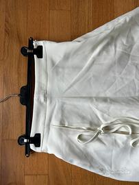 Vendo splendida gonna midi color bianco panna, realizzata in un tessuto fluido e leggero, perfetto per la primavera e l’estate. La gonna presenta una linea svasata molto femminile e raffinata, con un dettaglio originale: una finta apertura laterale chiusa da due laccetti decorativi che formano delicati fiocchi, donando movimento e stile al capo.